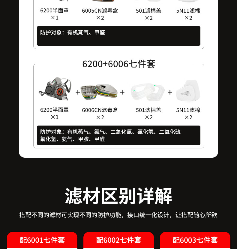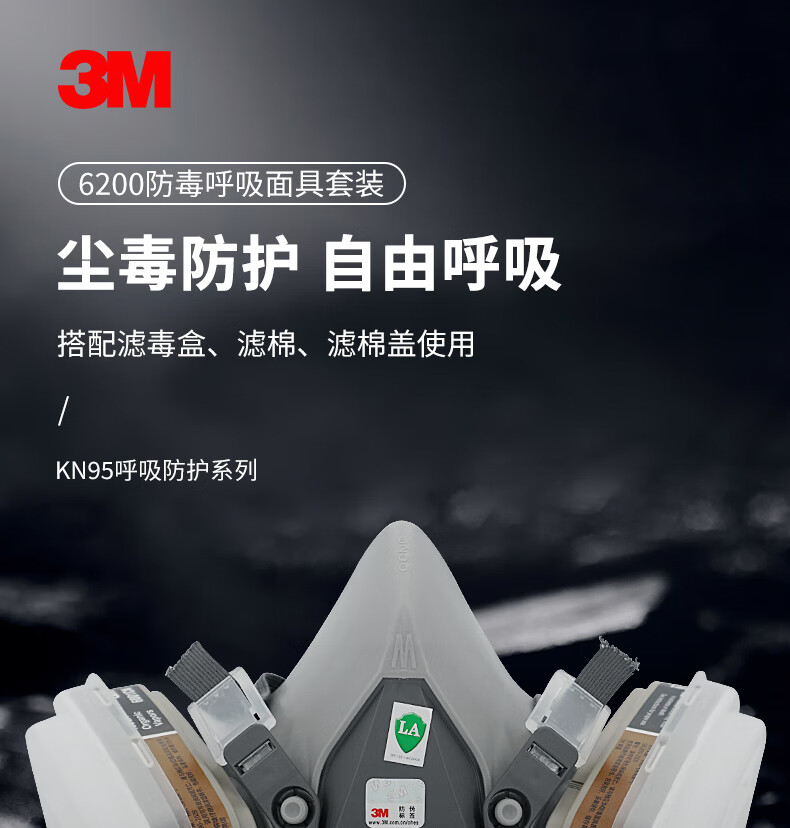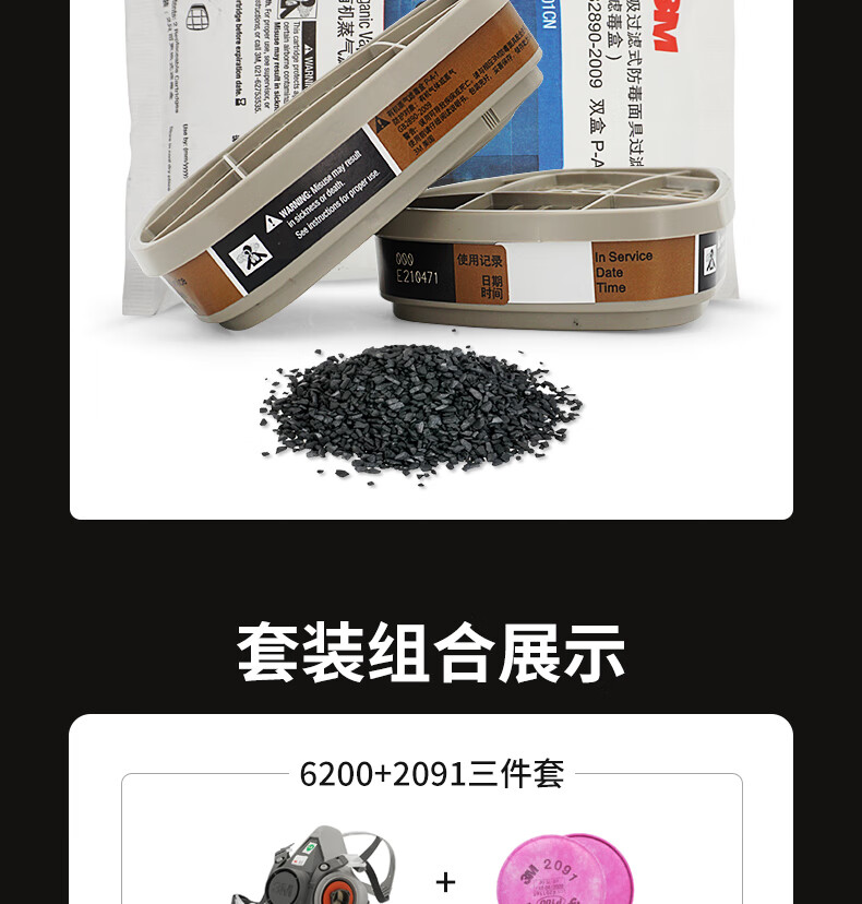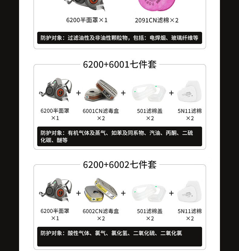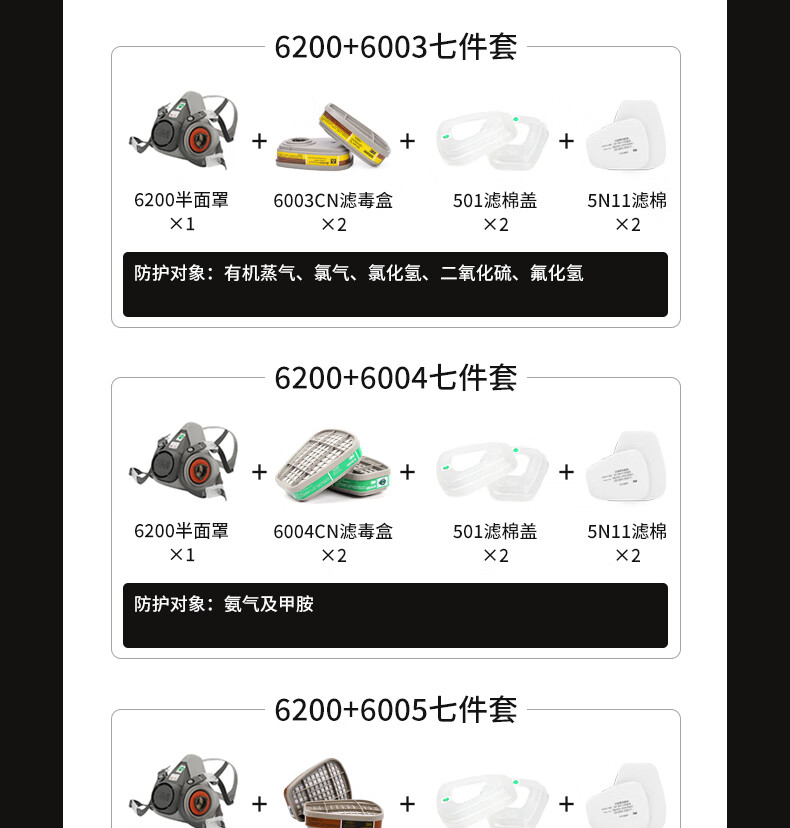 3M防毒面具喷漆防尘防有机气体防毒面罩面具套装(6200+6001 七件套)