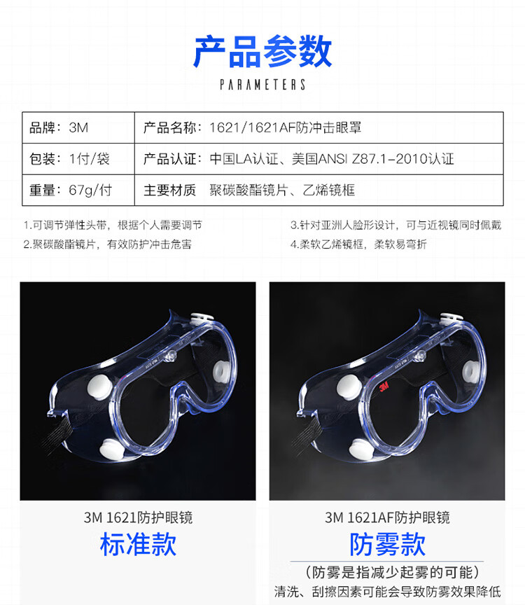 3M 1621护目镜 防花粉尘风沙防化学飞溅工业防冲击劳保防护眼罩