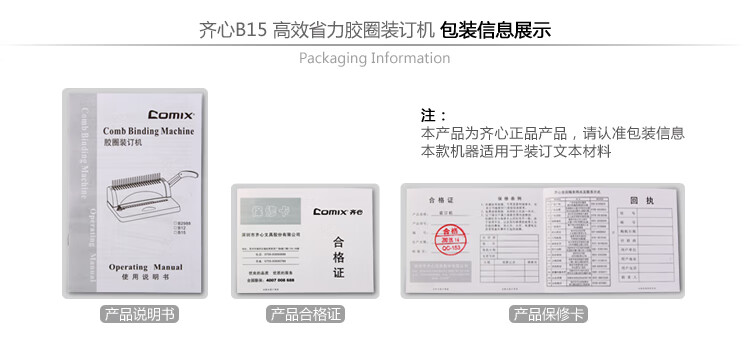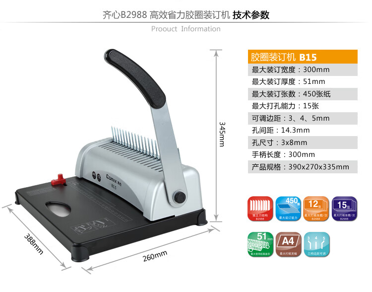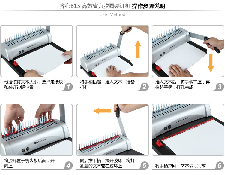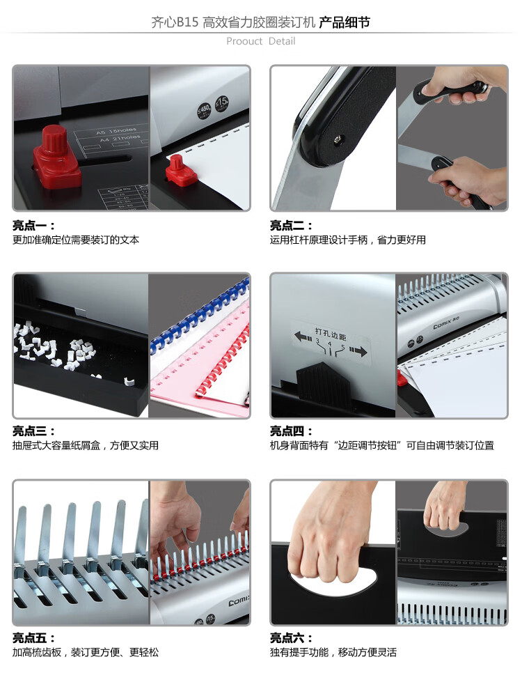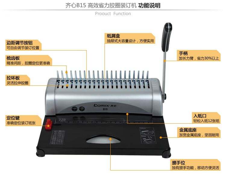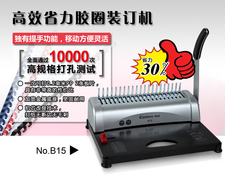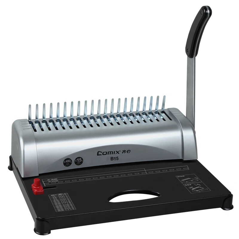 齐心(COMIX)B15 胶圈手动装订机 高效省力打孔15张 黑+银