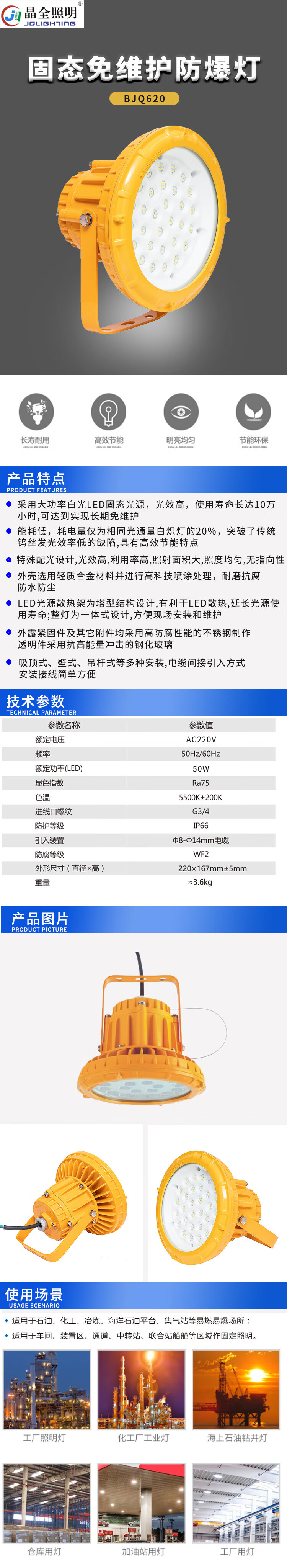 晶全照明 固态免维护防爆灯 BJQ620 50W 黄色 AC220V