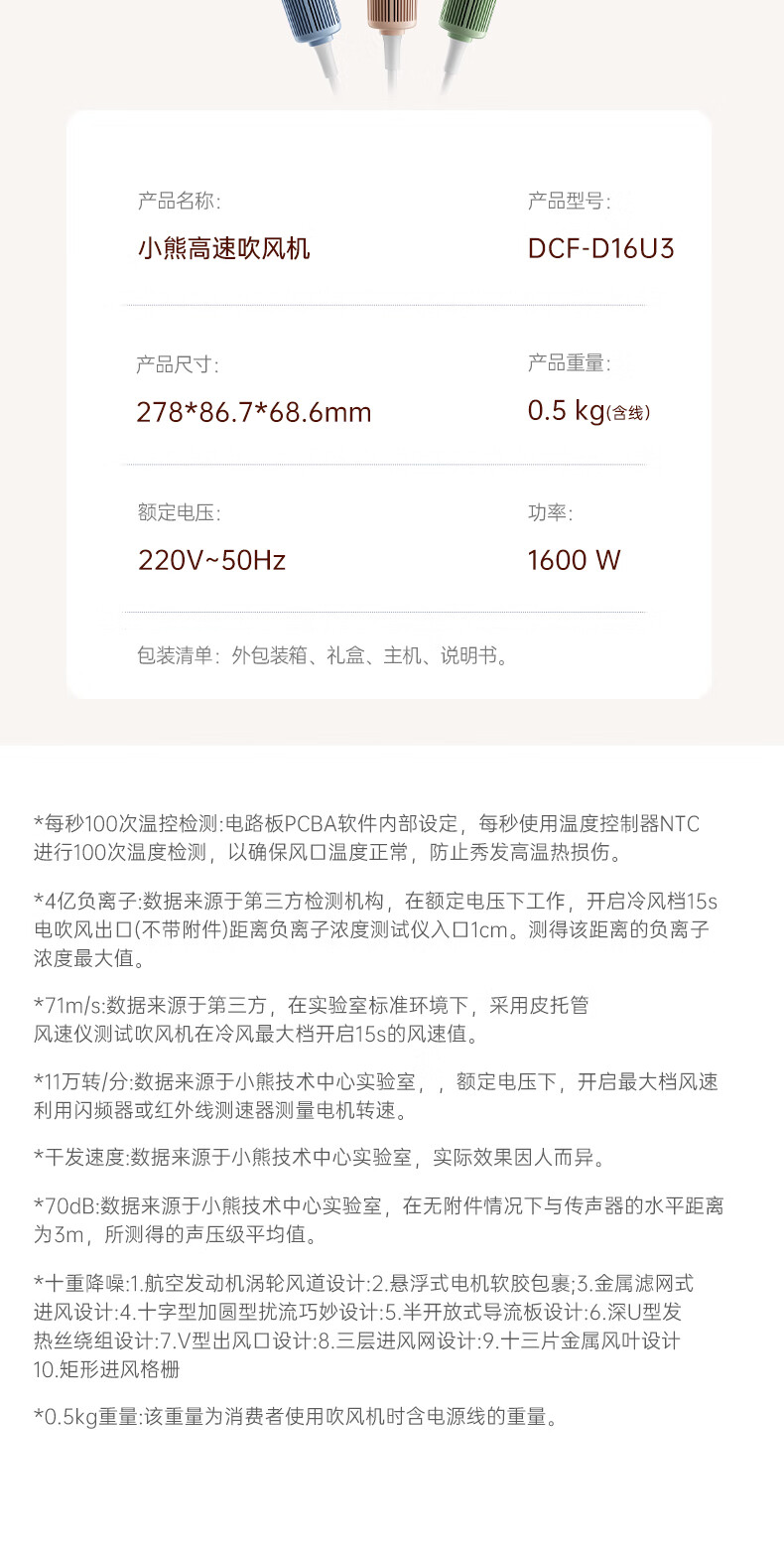 小熊吹风机DCF-D16U3-P01一个装