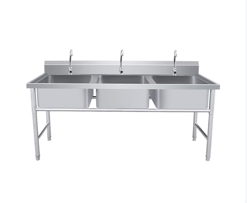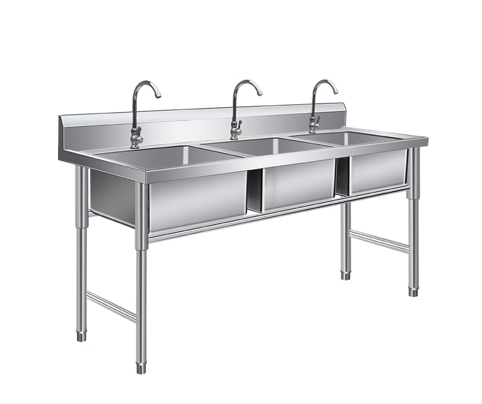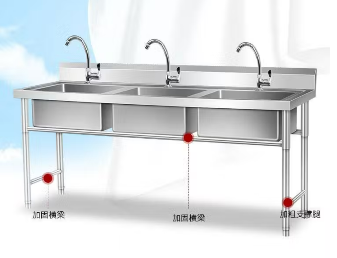 1、所有不锈钢板采用304优质不锈钢; 2、面板和洗槽采用1.2mm不锈钢板; 3、面板配作有结构加强筋板; 4、支撑脚管采用φ38*1.2mm不锈钢管(上部配装有装饰脚杯),并配有φ38mm可调节脚; 5、连接横管采用38*25*1.2mm不锈钢管; 6、洗盆的落水口配备带过滤网的下水器,不易堵塞,易清洗残渣。